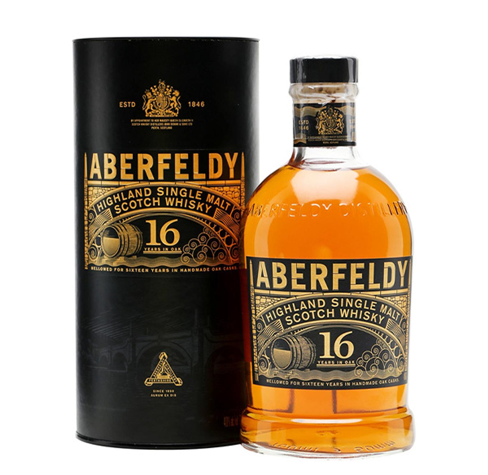Aberfeldy 16 Year Old is a single malt Scotch whisky from the Aberfeldy Distillery in the Scottish Highlands. The whisky is matured in a combination of first-fill, re-fill, and re-charred bourbon casks before being finished for six months in first-fill Oloroso sherry casks, which imparts a fruity and rich character.