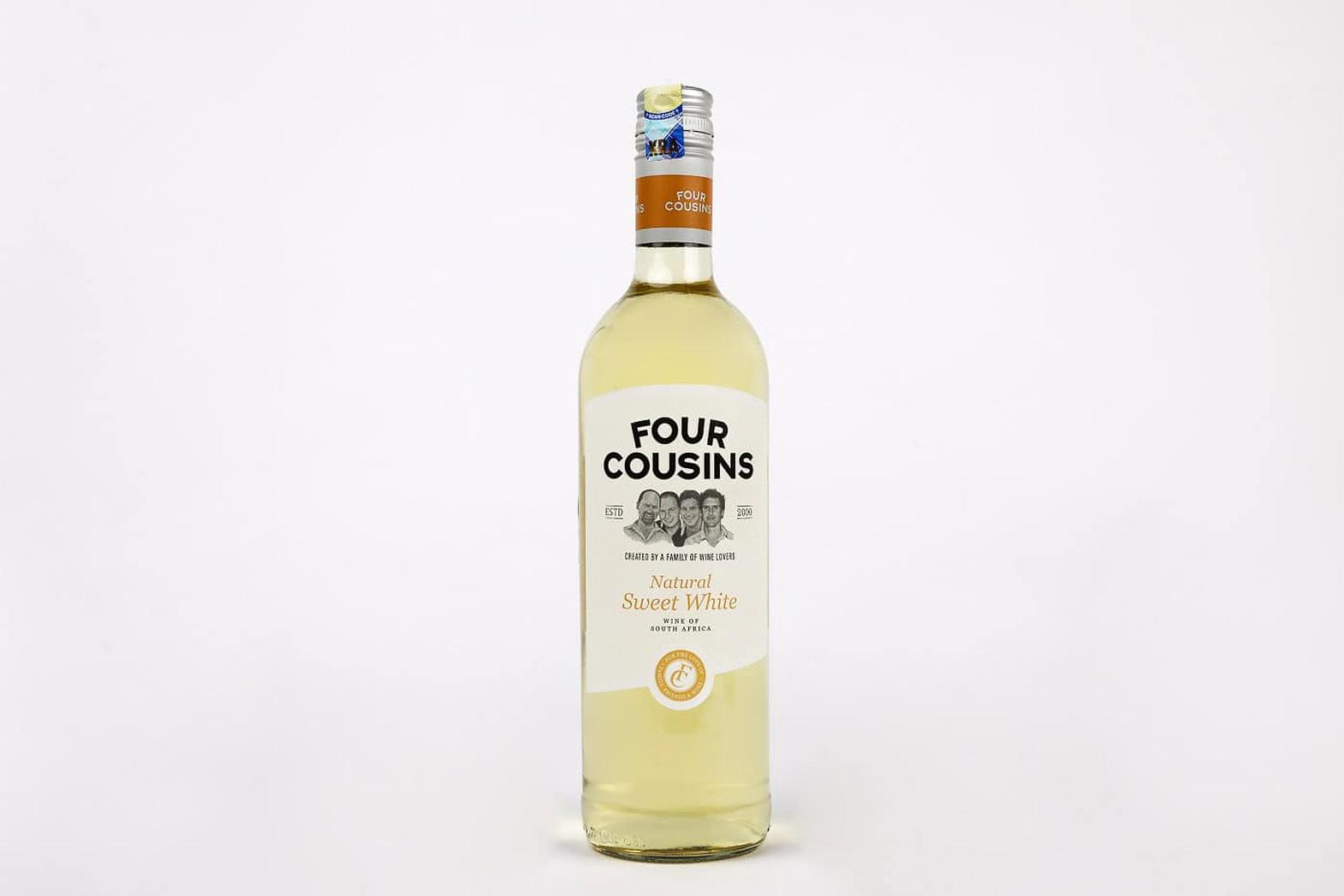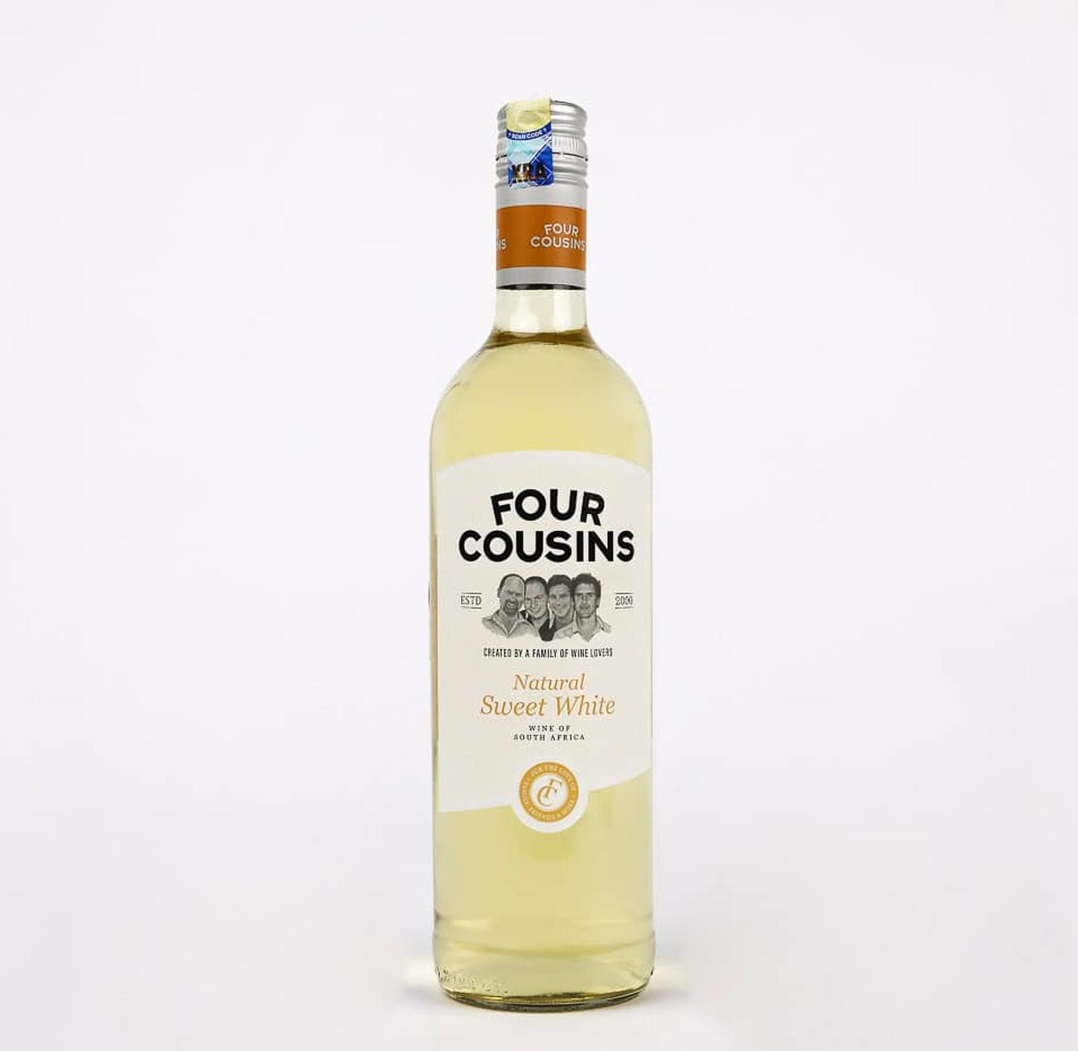 Four Cousins Natural Sweet White is a sweet white wine made in South Africa, produced by the Four Cousins line of Van Loveren Family Vineyards. It is a blended wine (white varietals plus grape juice / white muscadel) designed to offer an easy-drinking, fragrant profile with broad appeal. Best served young and chilled, it is made for everyday enjoyment and lighter palates.