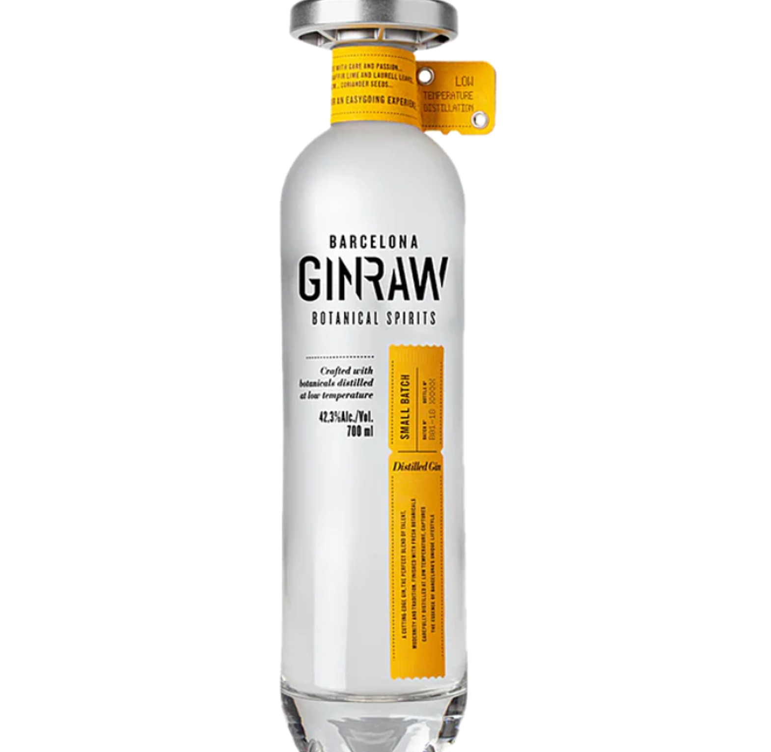 GinRaw Gastronomic Gin is a premium gin from Barcelona, Spain. It is made by two entrepreneurs together with a chef, sommelier, perfumer, and mixologist. The distillation process is dual-stage: juniper and a grain-based neutral spirit are distilled in copper stills, while the other botanicals are macerated then separately distilled at low temperature using a Rotaval® apparatus. The final blend includes both Mediterranean botanicals (lemon peel, citron peel, laurel) and more exotic ones (kaffir lime leaves, Indian black cardamom, Egyptian coriander seeds). It is produced in small batches (≈5,000 bottles per batch) and bottled at