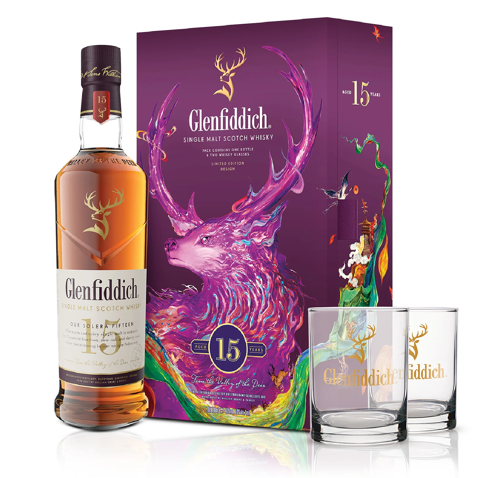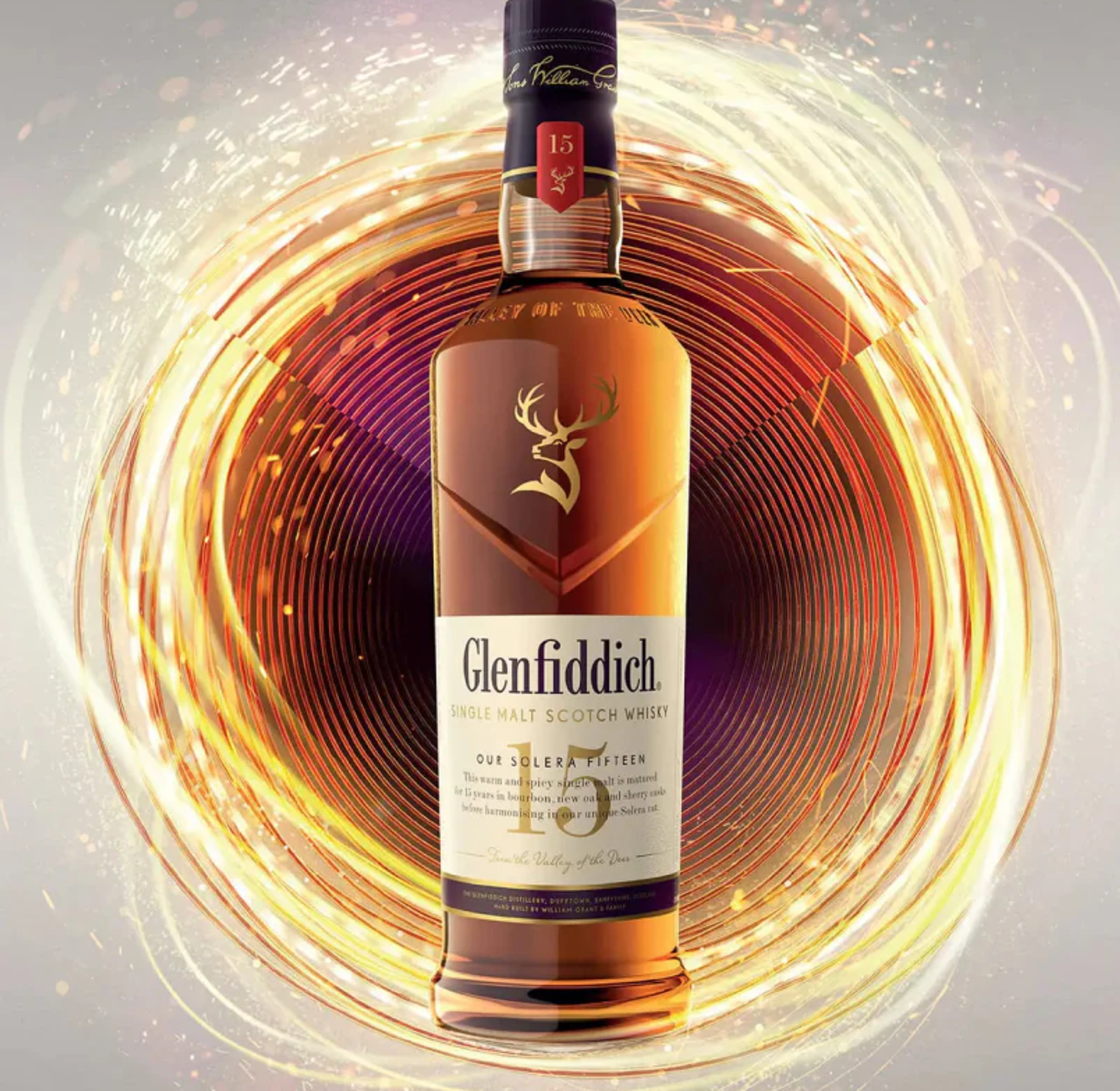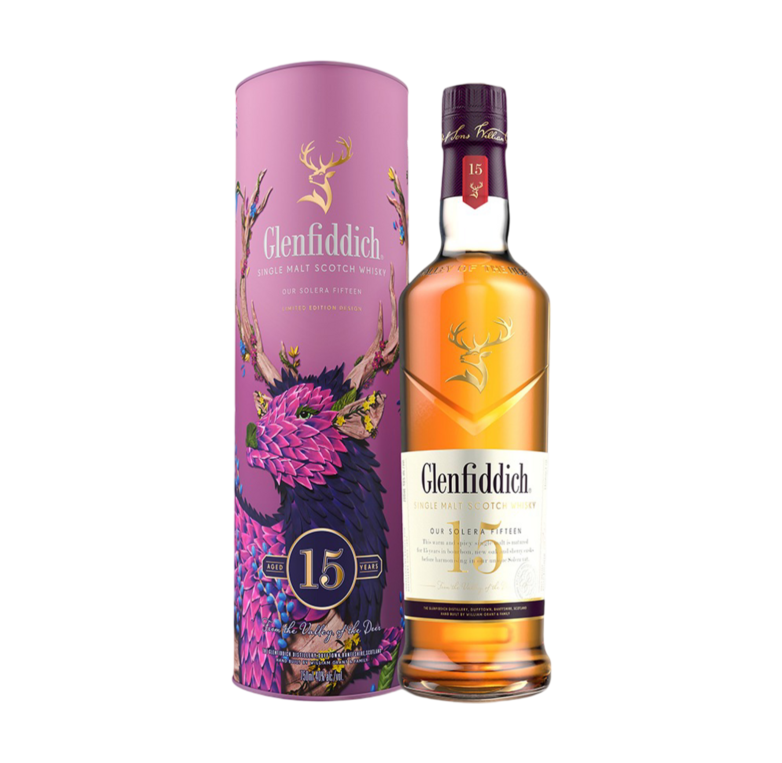 Glenfiddich 15 is a rich, warm, and complex single malt, matured in sherry, bourbon, and new oak casks, then uniquely finished in a Solera Vat for a smooth, layered whisky with notes of honey, spice, dried fruit, and oak.
