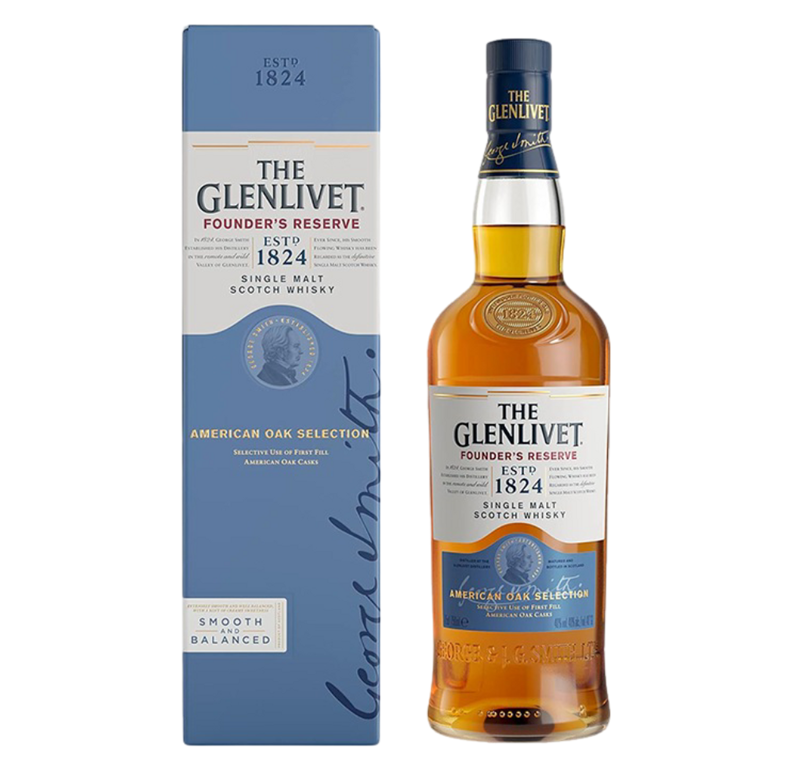 The Glenlivet Founder’s Reserve is a smooth, sweet, and fruit-forward single malt, celebrating the original style created by founder George Smith, with notes of pear, citrus, creamy toffee, and soft vanilla.