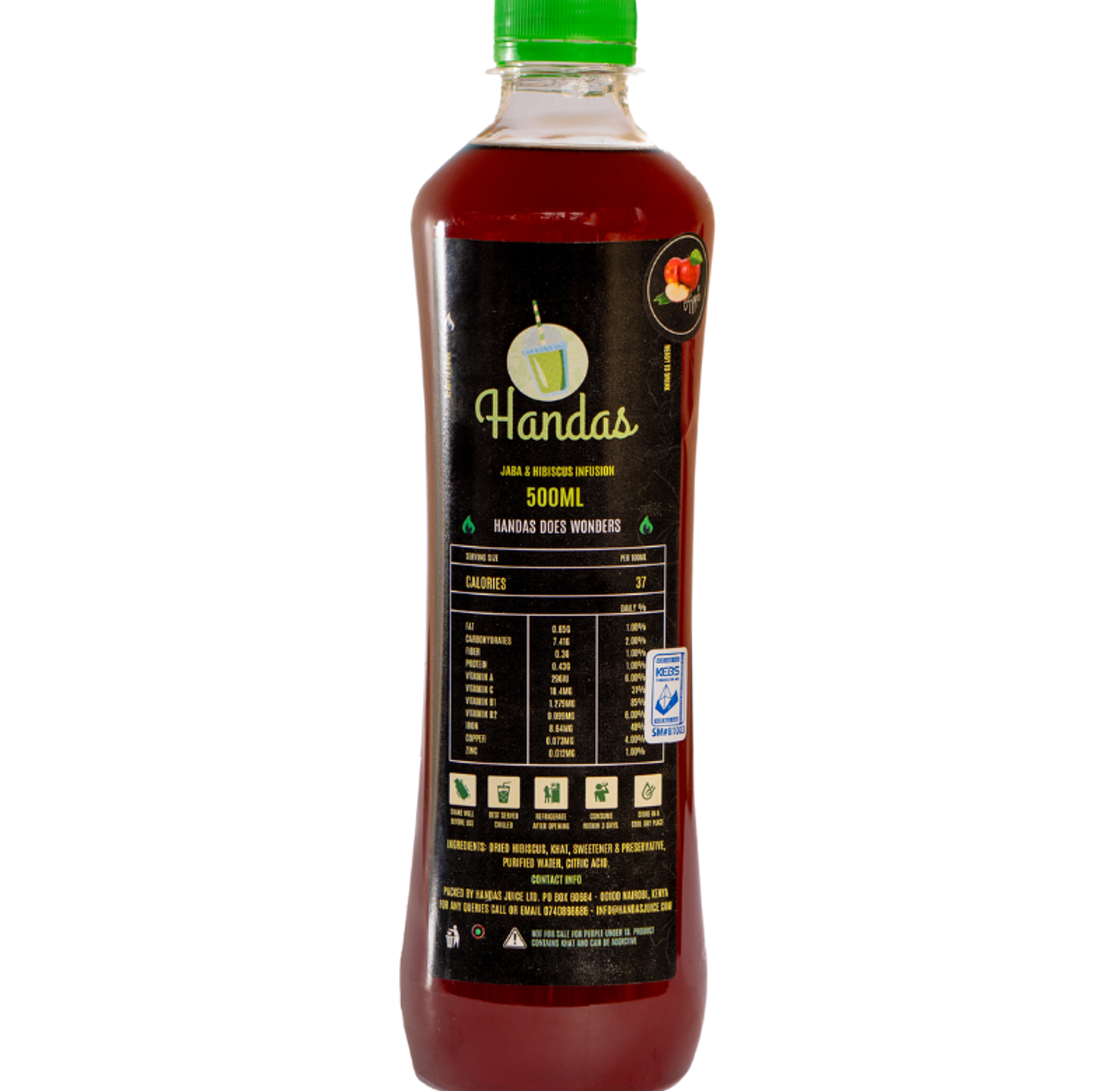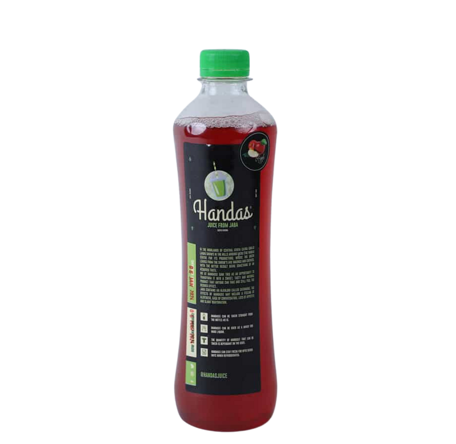 Handas Jaba Juice is a Kenyan beverage that transforms the traditional stimulant khat (locally called jaba or miraa) into a liquid format. The juice is processed by cold-pressing or distillation, then flavored (variants include hibiscus, strawberry, blackcurrant, apple, etc.). The 500 ml plastic bottle version typically refers to its distilled form. It aims to preserve stimulant compounds like cathinone while offering ease of drinking and portability. The business also markets sparkling variants.