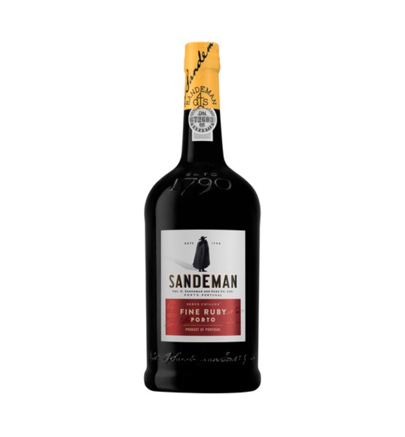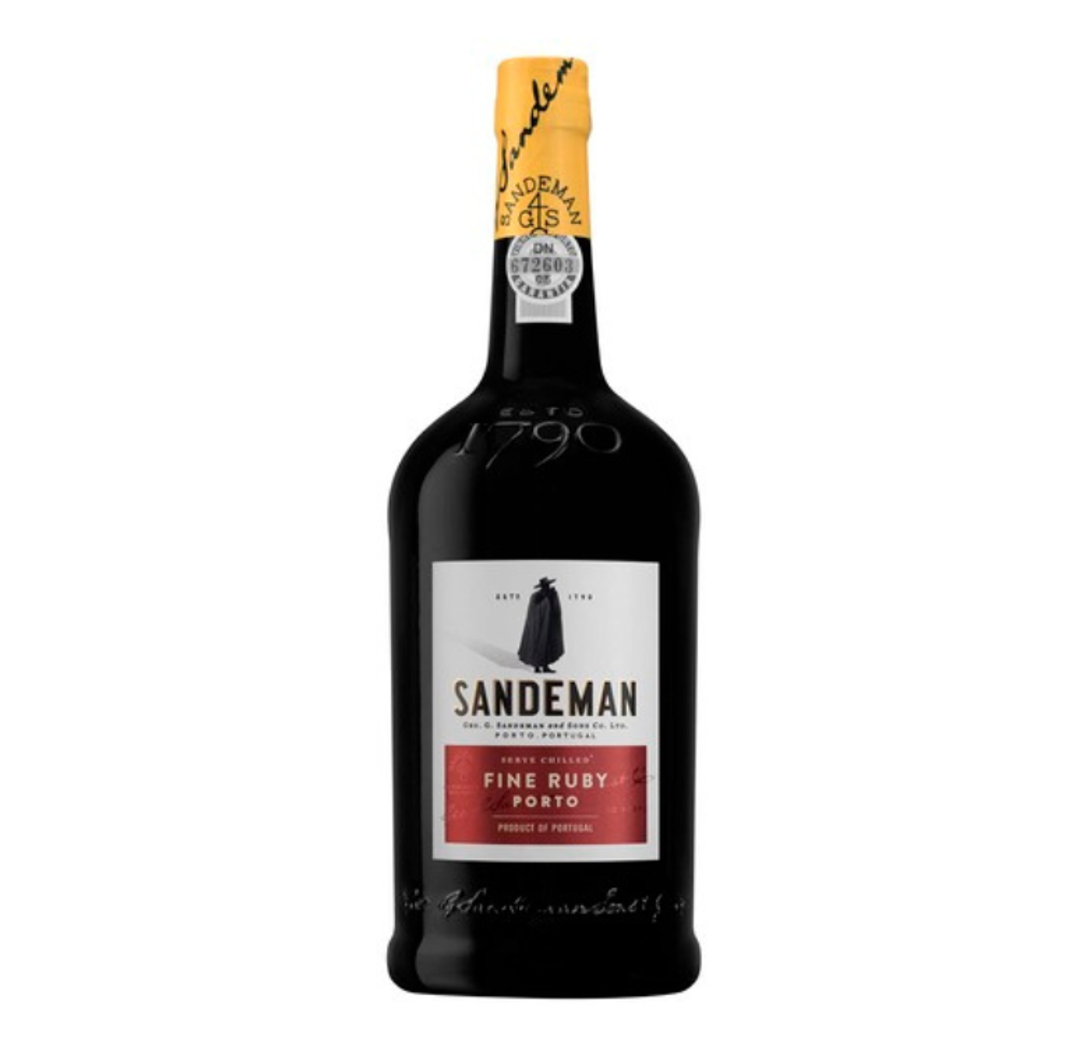 Sandeman Fine Ruby Port is a classic Portuguese fortified wine produced by Sogrape Vinhos in the Douro Valley. Crafted from a blend of traditional grape varieties—including Tinta Barroca, Touriga Nacional, Tinta Roriz, Tinto Cão, and Touriga Franca—this port undergoes fermentation with skin maceration to extract optimal color and flavor. The wine is then aged in oak casks in Vila Nova de Gaia, allowing it to develop its signature depth and finesse. This port pays homage to the original ruby Ports shipped by George Sandeman in 1790, maintaining a rich, robust character with a modern balance.