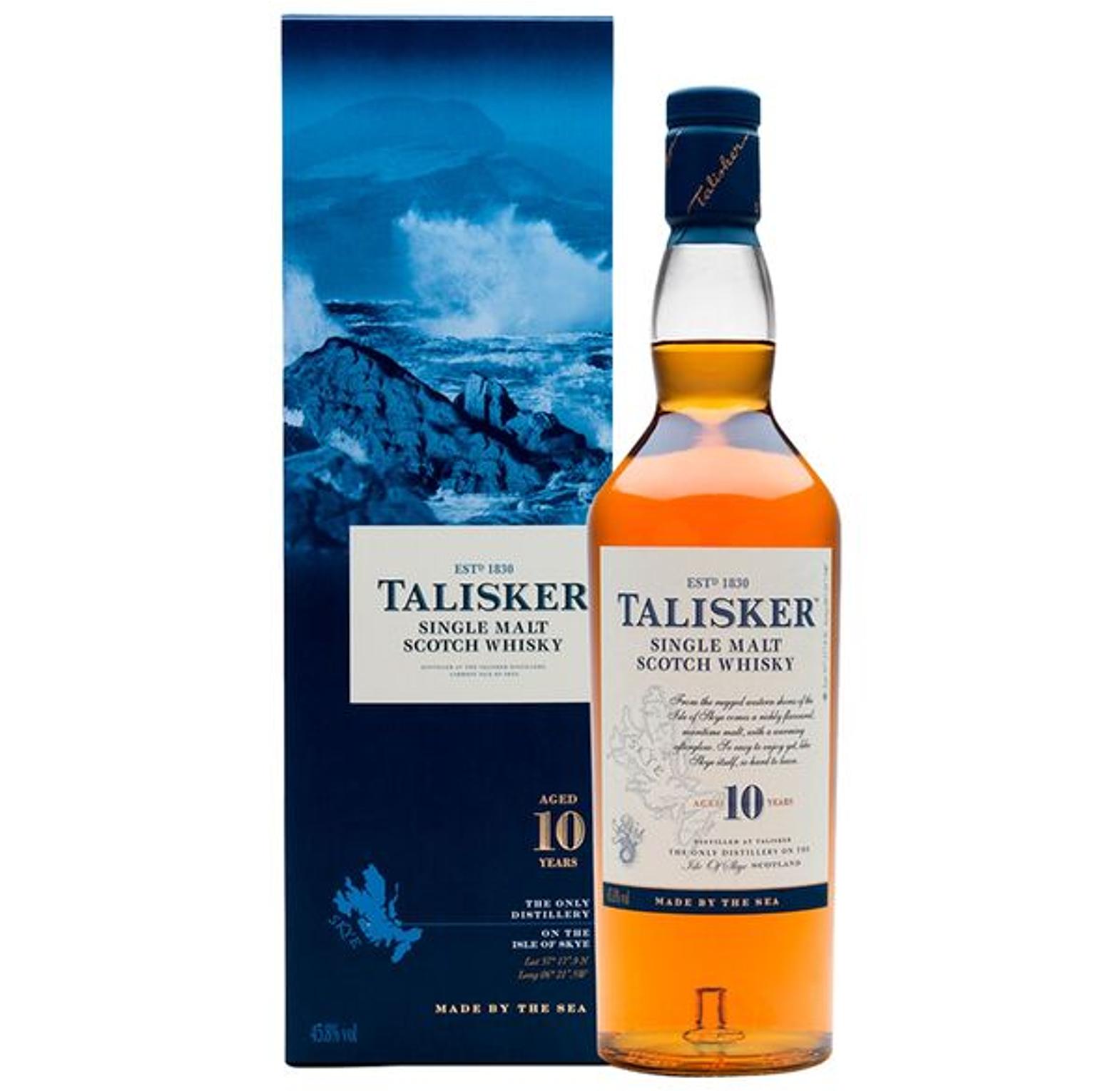 Talisker 10 Years Old is a single malt Scotch whisky distilled on the Isle of Skye (Talisker Distillery). It’s matured for a minimum of 10 years — mostly in ex-American oak casks — and bottled at 45.8% ABV. Part of Diageo’s Classic Malts range, it’s known for a maritime and smoky profile, with strong coastal influence, moderate peat, and warming spice.
